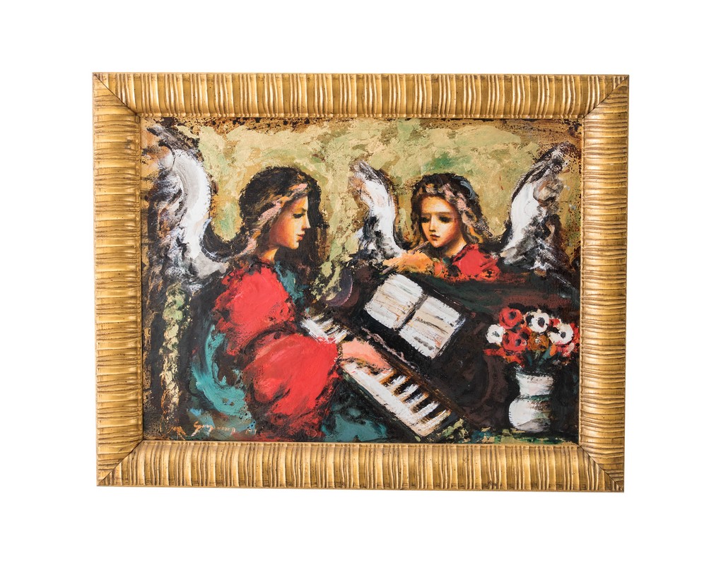 Ένα εξαιρετικό έργο του αείμνηστου ζωγράφου Μιλτιάδη Γκατζώνη, ο οποίος άφησε ανεξίτηλο το στίγμα του στη σύγχρονη ελληνική ζωγραφική. Ο πίνακας απεικονίζει μια λυρική σκηνή με αγγέλους και μουσικά στοιχεία, αποπνέοντας ρομαντισμό, πνευματικότητα και μια διαχρονική αίσθηση γαλήνης.