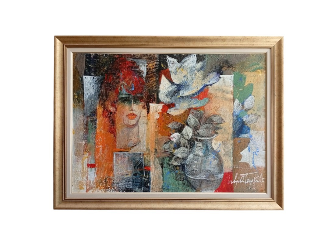 Ένα εντυπωσιακό και πολυδιάστατο έργο της διακεκριμένης εικαστικού Κατερίνας Γεωργαντά, που ενώνει την αφηρημένη έκφραση με την ανθρώπινη μορφή και τα σύμβολα της φύσης. Μέσα από έντονες χρωματικές αντιθέσεις, ένταση γραμμών και υφών, το έργο ζωντανεύει μια μυστηριώδη γυναικεία φιγούρα πλαισιωμένη από περιστέρια και ανθισμένα φυτά, μεταφέροντας στον θεατή αίσθηση εσωτερικής αναζήτησης και ψυχικής απελευθέρωσης.